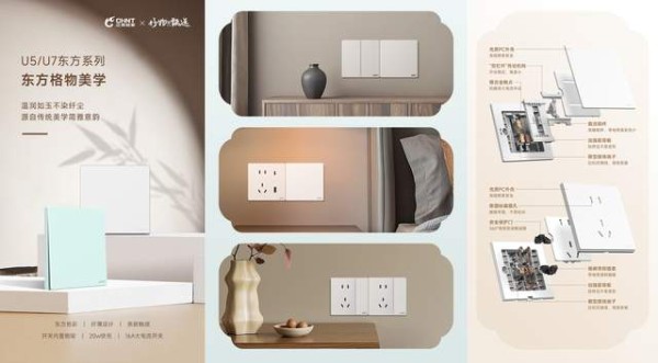 正泰开关U5/U7东方美学系列,从东方美学智慧中汲取灵感,对传统文化元素的深度挖掘与现代转译,使产品超越了功能属性。采用的6.3mm纤薄面板设计,既符合现代极简审美,又暗合传统美学中"大道至简"的东方哲思。以 "层次美学 + 品质手感" 为设计语言,U5叙东方系列将微阶错落的东方意境、云般温润的触感与"步步高升" 的美好祝愿融于一体,为空间增添含蓄而灵动的层次美;U7御东方系列以瓷玉为设计灵感,以产品为媒介展露东方美学的意境之美、和谐之美、灵动之美,为家居空间注入东方美学氛围感。