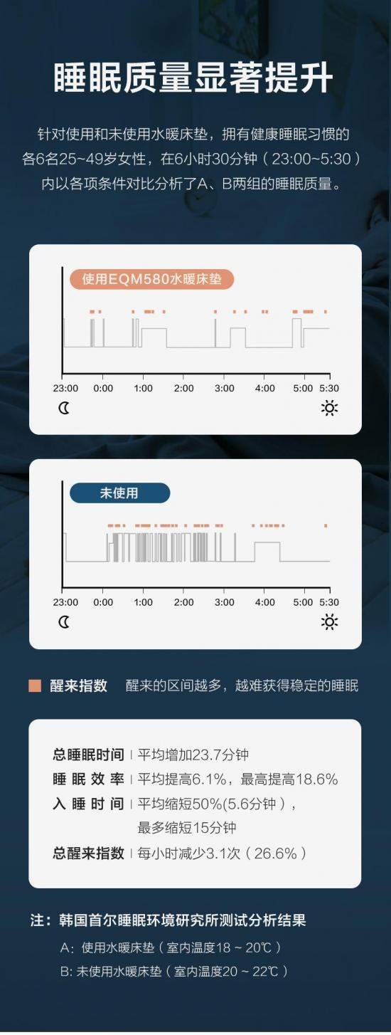 便捷性设计同样贴合用户需求,EQM580系列支持WiFi远程、无线遥控器、主机按键三种调控方式,实测手机APP远程操控响应速度≤1秒,可提前预热床垫;一键自动排水功能,实测排水时间不超过3分钟,换季收纳更省心。经韩国首尔睡眠环境研究所测试,使用该床垫的受试者,入睡时间平均缩短50%,睡眠效率提升6.1%,总睡眠时间平均增加23.7分钟,充分印证其助眠优势。
