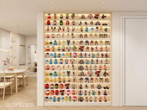 在过道墙面定制15cm进深的薄柜,既可以节省空间,又能将手办变成过道中的精致风景。