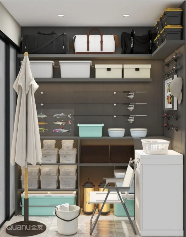只需在阳台或储物间找一面墙,安装几排挂钩,将鱼竿、渔轮等长型渔具整齐悬挂起来,既避免缠绕,又方便快速拿取。