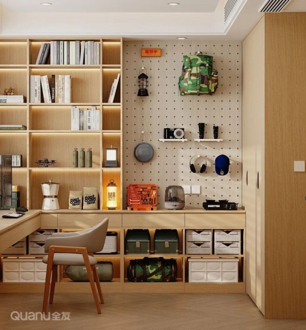 在左侧定制开放式置物柜,陈列露营灯、水杯等轻巧装备;墙面则安装洞洞板,利用挂钩和层板悬挂常用小件,方便随时取用;书桌下方开放格则用于收纳露营背包、工具箱等较大物品。