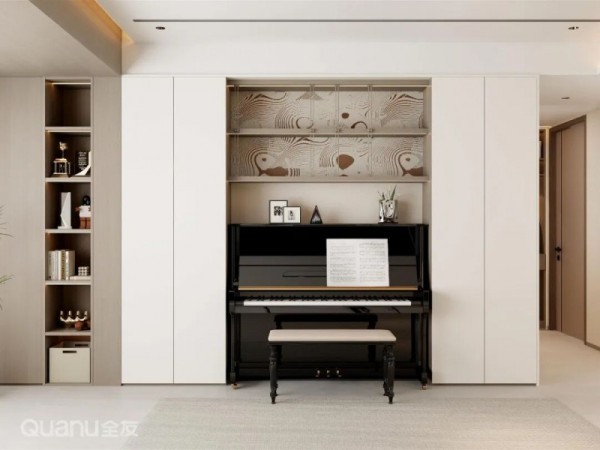 还在为钢琴占用客厅空间而烦恼?可以定制一面内嵌式整墙柜,将钢琴巧妙嵌入其中,不仅能节省占地面积,还能收纳客厅杂物,让客厅保持整洁清爽。