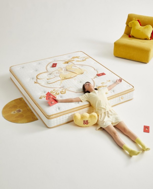 在外观上,新品床垫将文化祝福与舒适体验巧妙结合。床垫表面以海棠花窗为外框设计,内嵌奔跑瑞马元素,寓意“金马踏云,纳福招财”。搭配葫芦纹、祥云等传统吉祥纹样,传递出福禄安康的美好寓意。睡在这张床垫上,让日子柔软温馨,财运源源而来。
