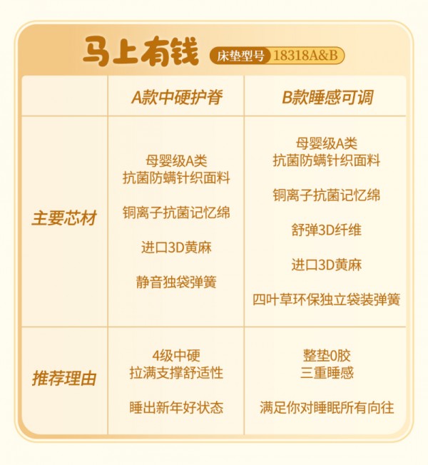 睡在吉言里,醒在好运中。“马上有钱”新品床垫已在全友家居全国门店上市销售,欢迎消费者前往线下门店咨询选购。
