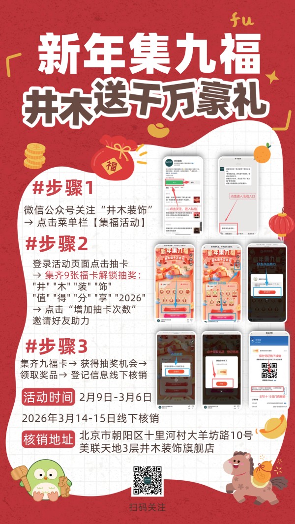 如此诚意满满的新春活动,参与方式也十分便捷,三步即可解锁抽奖福利。第一步,微信搜索并关注“井木装饰”官方公众号,点击菜单栏中的【集福活动】,就能进入活动专题页,开启集福之旅;第二步,进入专题页后,通过每日抽卡、邀请好友助力等方式,收集九张福卡,好友助力还能增加抽卡次数,让集卡更高效;第三步,集齐九张福卡后,系统将自动为参与者解锁一次抽奖机会,点击抽奖即可知晓中奖结果,中奖后按页面提示提交相关信息,完成信息登记后,便可等待线下核销兑奖。