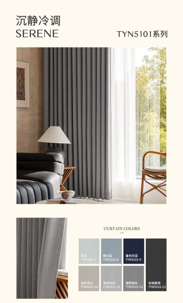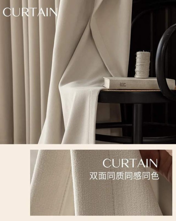 高支高密织造工艺,赋予面料无可置疑的厚重感与骨感,这不仅成就了视觉上的垂顺挺括,更带来了出色的遮光效果。目光所及,是温润饱满的绒感;指尖所触,是细腻扎实的质地。