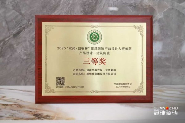 深耕建筑装饰领域,以创新力持续推动行业前行!冠珠华脉岩板雍华京韵系列「京绣繁瑞」凭借产品艺术审美、人居空间应用及文化传承价值,获评2025京闻·创响杯建筑装饰产品设计大赛“产品设计-建筑陶瓷三等奖”。