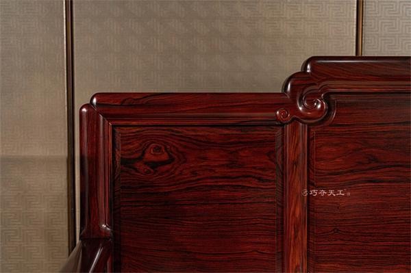 扶手拐角处做成委角,消除了生硬的棱角,触感圆润。末端以勾云纹造型点缀,有富贵吉祥之意。