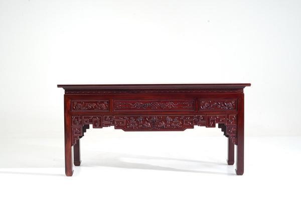 古森红木《福纳财运条桌》简约方正的造型搭配回字纹,寓意财源流转不息