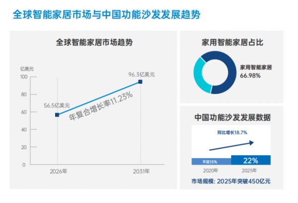 从数据看,智能家居赛道无疑是繁荣的。全球智能家居市场规模预计从2026年的56.5亿美元增长至2031年的96.3亿美元,中国功能沙发渗透率正从2020年的不足15%向2025年的22%爬升,2025年市场规模突破450亿元,同比增长18.7%。