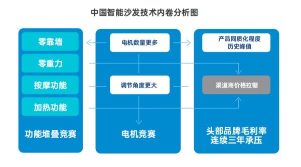 但繁荣之下,是深刻的焦虑。当前中国智能沙发市场的竞争,本质上是“电机竞赛”与“功能堆叠竞赛”——所有创新都沿着电机数量更多、调节角度更大展开,产品同质化达到历史峰值,渠道商陷入价格拉锯,头部品牌毛利率连续三年承压。核心问题在于:这些真的是“智能”吗?电动调节诞生于上世纪80年代,语音控制2018年已成为高端沙发标配。将这些功能简单打包冠以“智能”之名,本质上是在消费概念而非创造价值。我们将此称为“功能内卷陷阱”。