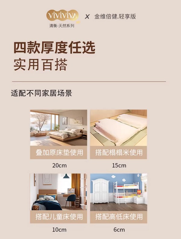 租房的空间和床型千奇百怪。这款穗宝金维倍健-轻享版6C床垫提供了6cm、10cm、15cm、20cm四种不同厚度。不管是直接铺在榻榻米上,还是垫在房东老旧床垫上加强支撑,都能灵活适应。穗宝还在侧边做了拉链窗口,里面用料看得清清楚楚,让我们买得明白又安心。