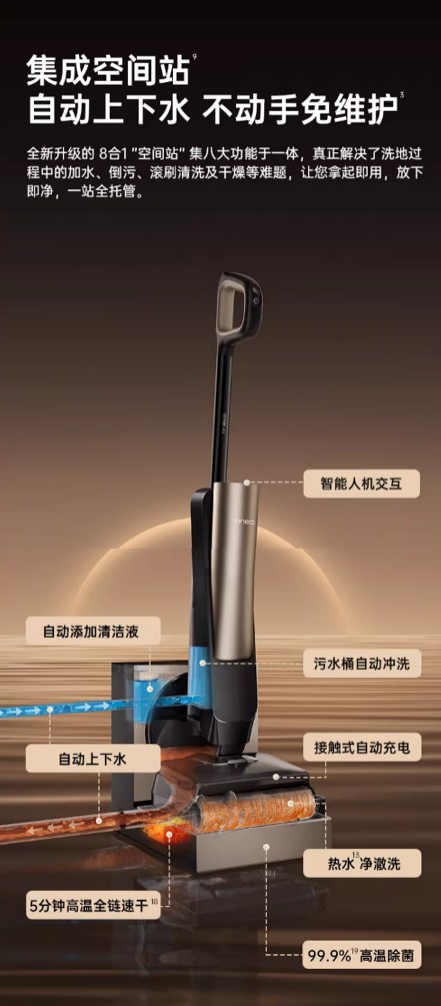空间站系列不仅拥有能自动上下水的“全能空间站”,更是“家电家居一体化”美学的集大成者。它不是只能藏在阳台或卫生间的清洁工具,而是能像现代艺术陈设般,优雅、无缝地融入各种家居环境,实现了硬核科技与生活美学的高度统一。