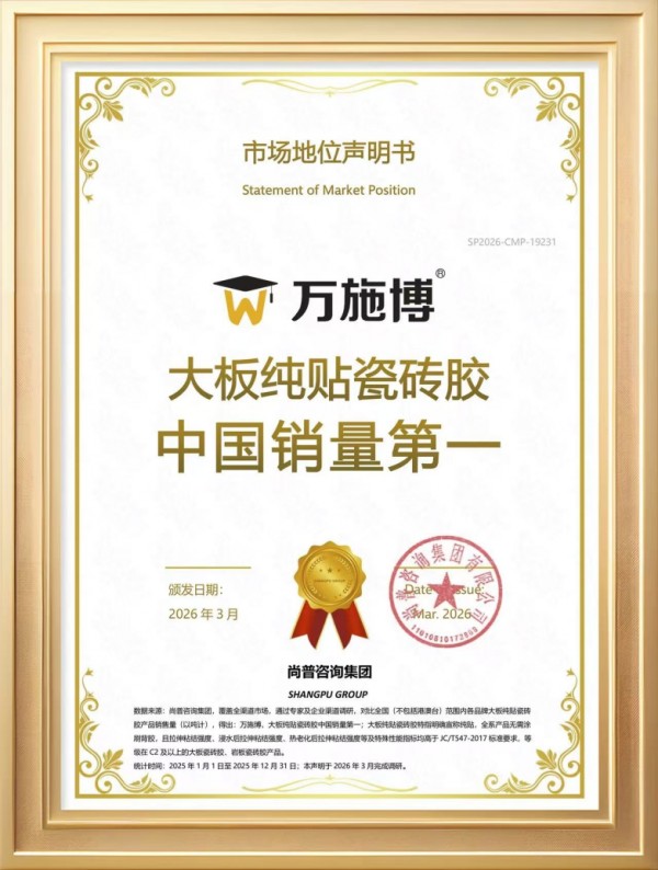 经过对全国范围内全渠道市场的深度调研与严谨数据比对,尚普咨询集团权威确认:“万施博,大板纯贴瓷砖胶中国销量第一”。