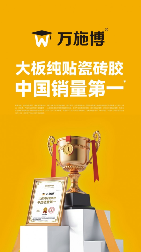此次尚普咨询集团的权威认证,是对万施博20年如一日坚持技术创新、品质至上最好的注脚。“万施博,大板纯贴瓷砖胶中国销量第一”,这不仅是一个市场地位的认证,更是中国市场对国货品牌技术实力的高度认可。