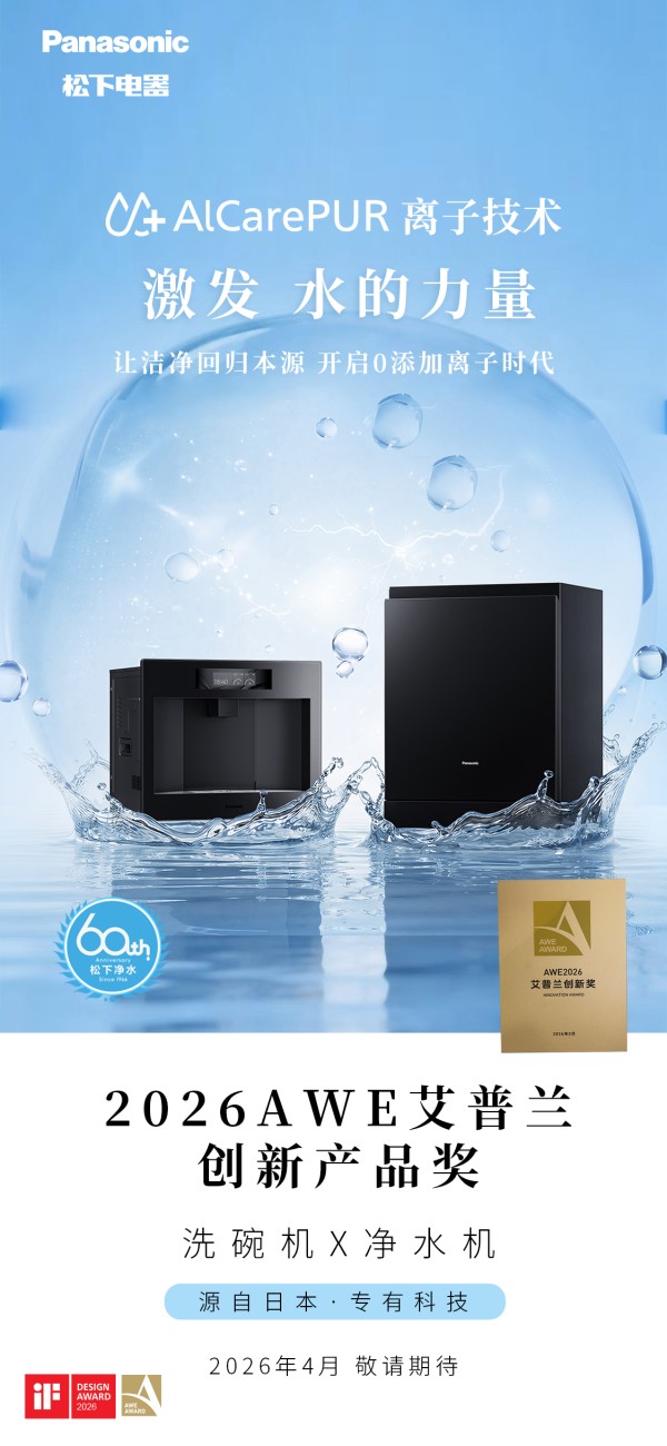 更是凭借与此,松下AlCarePUR离子技术双产品荣获2026AWE艾普兰创新产品奖,这一奖项的获得,不仅意味着松下AlCarePUR离子技术及搭载该技术的双产品获得行业权威认可,也为洗碗机、净饮机的多元化发展提供了更多可能。