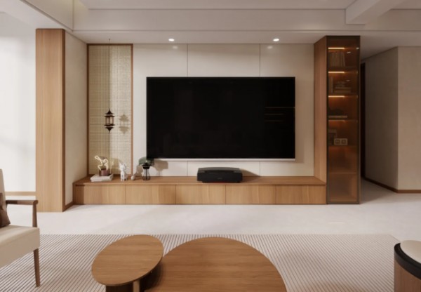 墙柜同色:墙面木饰板与柜体采用同色系,可以模糊边界,使空间显大。