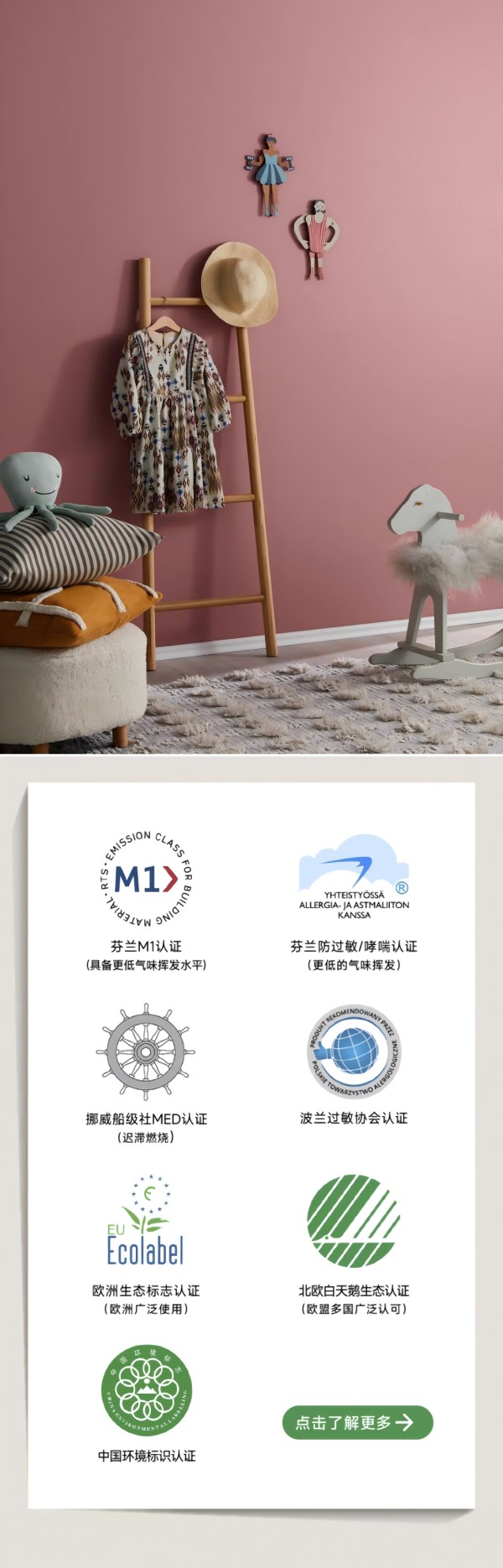 芬琳通过了七大高含金量环保认证(芬兰M1环境标识认证、防过敏协会认证、欧洲生态标识认证、挪威船级社MED认证、北欧白天鹅生态认证及中国环境标识认证),把看不见的隐患挡在门外,让幸福纯粹而干净。