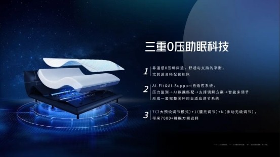 值得注意的是,AI-Smart3.0的另一大亮点是三重0压助眠,系统化帮助用户实现“压力小,睡得好”:AI-Fit + AI-Support自适应系统,叠加超适配智能床的梦百合非温感0压绵床垫,加上预设的7大调节模式,组成三重0压助眠科技系统。
