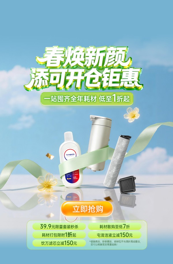 对用户的关怀,不仅体现在换新购机的那一刻,更贯穿于产品使用的全生命周期。春季大扫除,机器使用频率倍增,耗材的需求也随之水涨船高。为了让用户更轻松地享受洁净生活,添可官方商城在3月同步推出了耗材专属福利。清洁液、滚刷等配件享“一件85折,两件8折,三件及以上75折”的阶梯优惠,更有每天上午10点的限量秒杀活动,让用户能以最低成本抢到超值好物,彻底实现“耗材自由”。