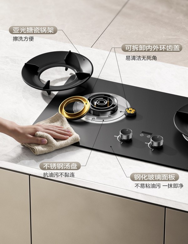 厨房里的佳肴着实让人着迷,但清洁难题也往往令人头疼。樱花燃气灶S510G采用全拆卸式的结构,火盖与聚能盘均可轻松提起,一冲即净,无死角设计彻底杜绝残渣油污的问题,从结构上保证厨房清洁更彻底;上凸式一体盛液盘可防止汤汁渗入内部,享受烹饪的同时无需再为污渍烦恼;AG亲肤玻璃质感的面板,既彰显大气时尚的格调,又让油污不易粘连,一抹即净,使厨房维护成为轻松高效的日常体验。