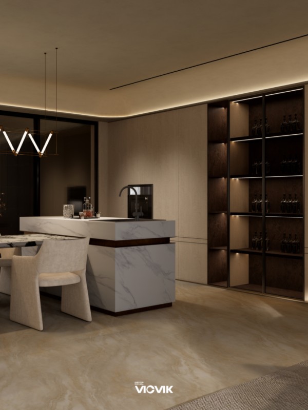 在空间应用上,VICVIK威克美学饰面板实现了不同功能区的自然衔接与美学统一,让静奢质感落地日常。客厅与书房的无界设计中,暖缕·纹叙墙体以温润艺术肌理为基底,如同空间的沉静呼吸自然蔓延;柔织·纹叙饰面板打造的展示柜,以细腻的织物感纹理在灯光下泛起朦胧光晕,与暖缕系列相融相生;弧形家具与浅雅米调书柜的搭配,让线条与肌理碰撞出静谧的阅读角落,墨香与木香在光影中交织,尽显静奢风的精致品味。