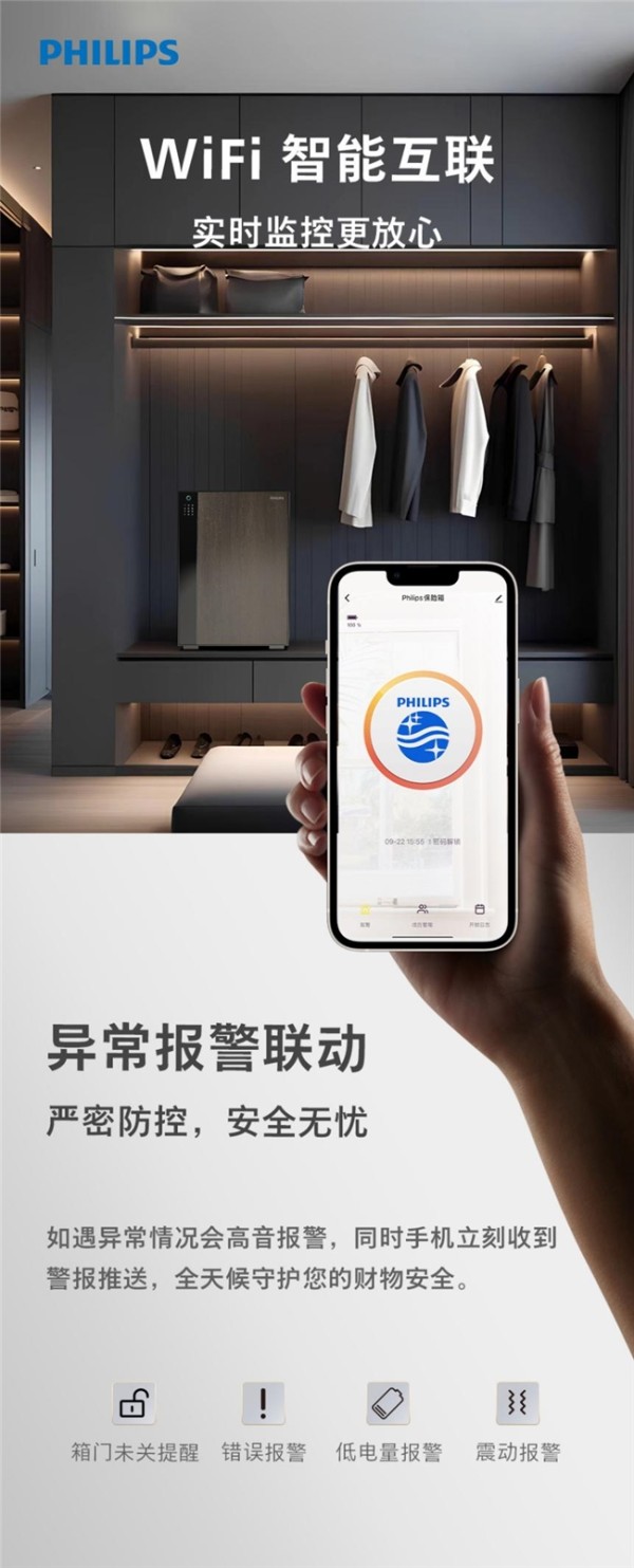 针对用户远程掌控安防状态的需求,飞利浦智能保险柜在智能系列产品中搭载WiFi智能互联功能,通过手机APP即可实时查看柜体状态与开合记录,实现“远程可视、实时可控”的主动安防。