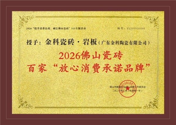 3月31日,由佛山市陶瓷放心工作委员会主办的2026知识产权日暨佛山百家陶瓷315“放心消费承诺品牌”宣誓大会在佛山隆重举行。在这场汇聚行业精英、彰显品牌责任的盛会上,金科瓷砖凭借多年来在产品质量、诚信经营与消费者服务方面的卓越表现,荣膺2026佛山瓷砖百家「放心消费承诺品牌」。