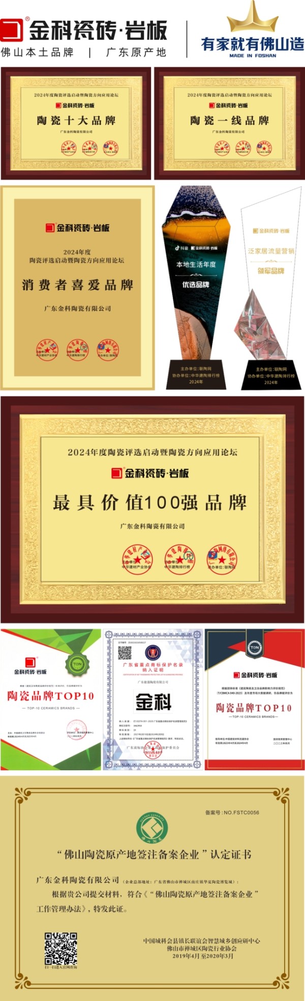 正是这份偏执的匠心,为其赢得了“最具价值100强品牌”、“行业知名品牌”、“佛山陶瓷原产地企业”等超过八十项权威认可。这些璀璨的荣誉勋章,共同构成了“金科瓷砖”品牌最坚实、最令人信服的“信任基石”。
