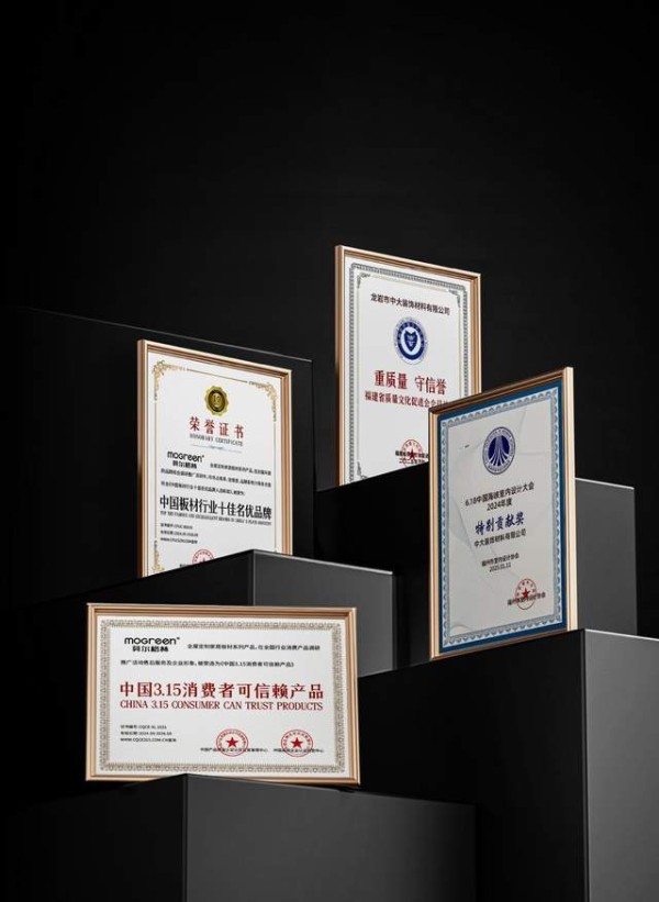 其次,双重环保认证+多重权威背书,给B端谈单 “硬底气”。莫尔格林的主营产品全都通过了F4星+ ENF级双重环保认证,这是目前板材行业顶端的环保标准,其中旗下品牌洁芯板,采用单一木种基材,去皮、水洗精细化处理,无异味,专门针对儿童房等健康敏感空间打造,客户看了认证就放心。除此之外,品牌还通过了ISO9001质量管理体系、ISO14001环境管理体系、十环认证三大权威体系认证,是福建省内为数不多拿到十环认证的饰面板品牌,这些实打实的背书,让B端谈高净值客户时,根本不用费口舌解释环保问题。
