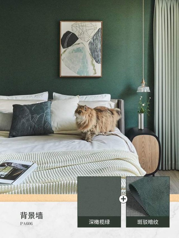 复古做旧的暗纹肌理,碰撞浓郁深邃的深橄榄绿,为卧室注入沉静有力的静谧氛围,让每一次入眠都被温柔包裹。
