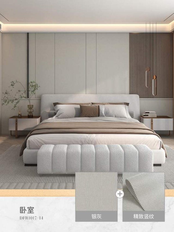 细腻竖向肌理拉伸层高,清冷柔和的银灰,搭配极简硬装,打造干净利落的现代风卧室,让睡眠环境通透清爽。