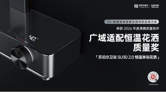产品发布会上,沸腾质量数据、酷家乐等三大行业权威机构共同见证产品发布,一致认可 SU30 2.0 Pro 重新定义了真恒温花洒的行业标准。苏泊尔卫浴也凭借在恒温适配领域的突破性表现,斩获沸腾质量数据颁发的 “广域适配恒温花洒质量奖”—— 这是国内卫浴行业针对恒温适配性的最高荣誉。