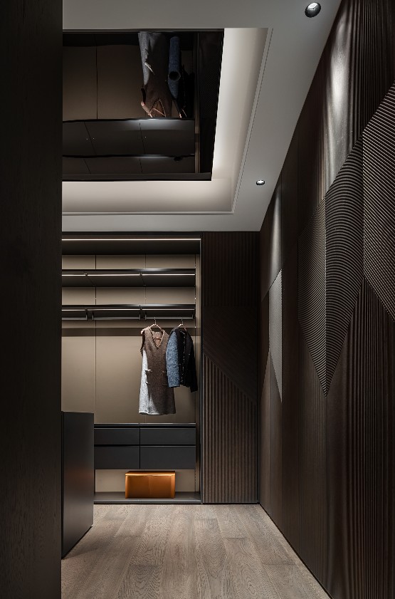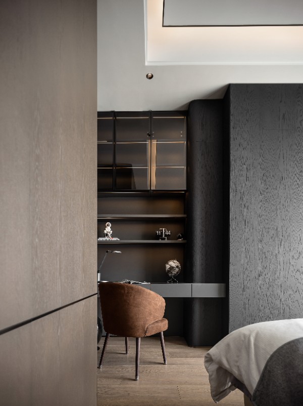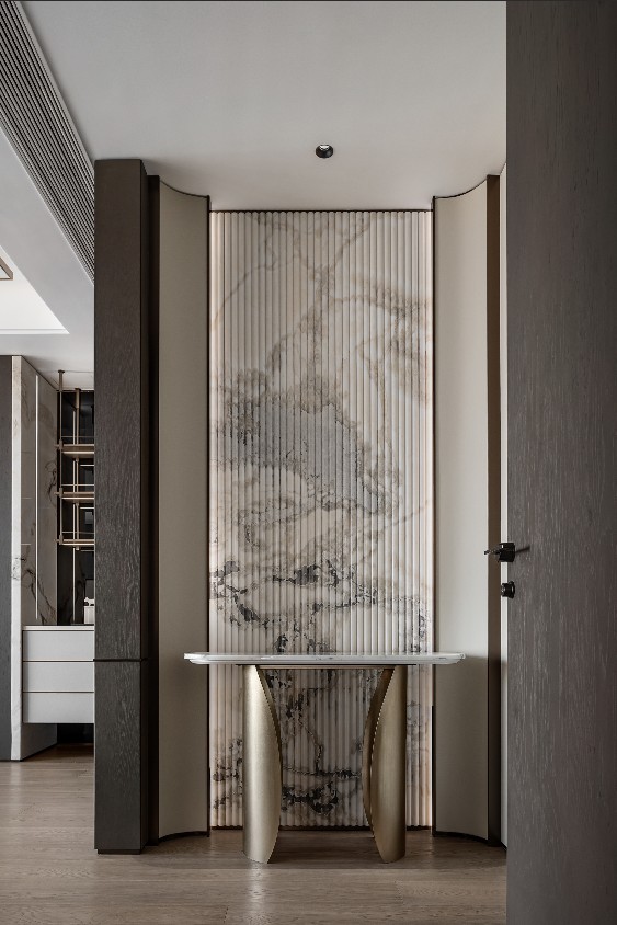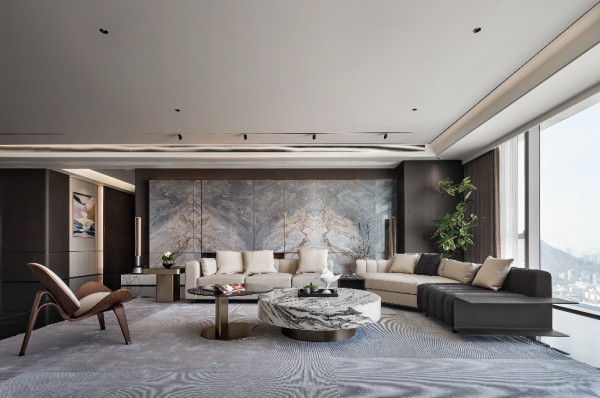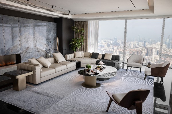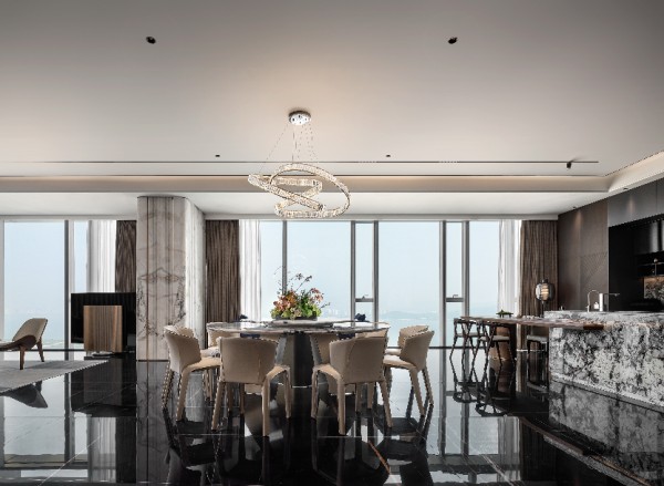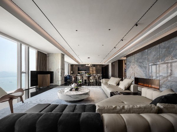 在距离海岸线仅百米的高层空中大平层中,我们以深色天然纹理木饰面为灵魂脉络,黑色岩板为骨骼架构,米色皮革为肌肤触感,构建了一座与海洋共呼吸的当代艺术居所。设计师摒弃传统海景房对“海洋元素”的直白堆砌,转而通过材质本身的肌理、光泽与质感,将浪涛的澎湃、礁石的深邃、沙滩的温润转化为空间语言,最终实现“人居空间既是观海者,亦是海洋本身”的哲学表达。这座568㎡的居所,不仅是物理意义的观景平台,更是一场关于材质、光影与自然三重奏的沉浸式剧场。