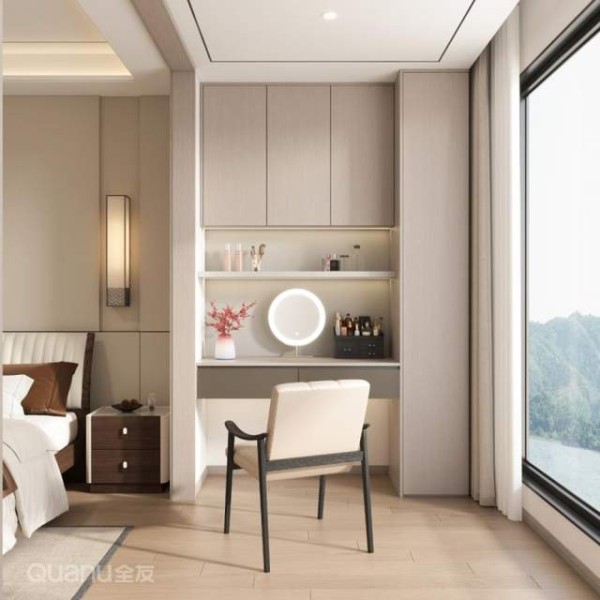 利用自然光化妆,效果更好!护肤品、彩妆、首饰,全部分类放进柜子里,关上柜门清清爽爽。多预留几个插座,卷发棒、美容仪、化妆镜灯,用着不打架。