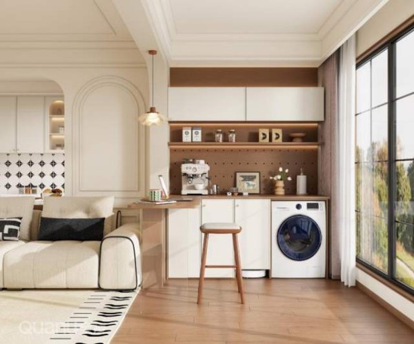 操作台做成西厨水吧、植物修剪台或熨衣区,都非常合适。吊柜+开放格+地柜组合起来,杯子、茶叶、小工具各就各位,怎么用都顺手。