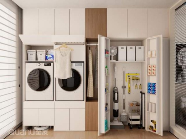 整墙收纳,秒变家政柜或工具柜;柜内搭配洞洞板,家政工具、螺丝刀统统能上墙,拿取很方便。