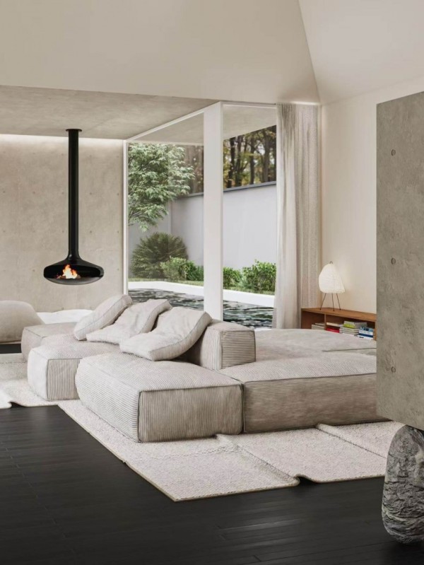 Ruth: 它是这个家的“心脏”。 传统的客厅往往围绕电视布置,但我们希望打破这种陈规。这盏黑色的悬挂壁炉像是一个现代装置艺术,它不仅解决了取暖的物理需求,更营造了一个围炉而坐的情感中心。火焰的动感与周围素雅、静止的混凝土墙面形成鲜明对比,赋予了空间一种原始的生命力。